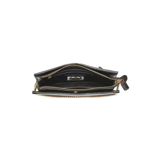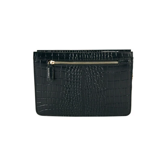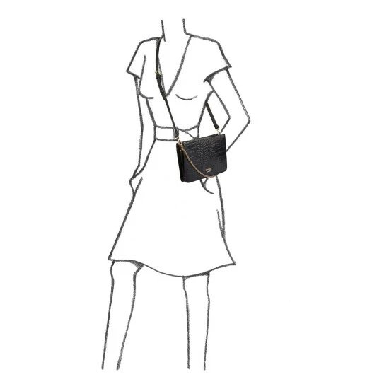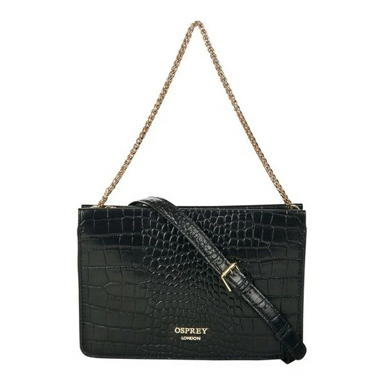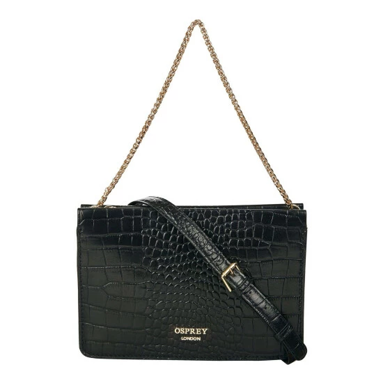 OSPREY LONDON slimline structured bag, handcrafted in black cowhide embossed with a croc print and given a high shine finish. Although slimline, this bag is gusseted and so is surprisingly spacious inside with a well organised tri-part interior. Sleek & versatile 2-in-1 design | Wear it as a chic shoulder bag on its delicate gold chain strap or attach the long leather strap and hey presto, it s a smart cross-body. Dimensions: H: 17.5 x L: 26 x W: 6 cm (20cm handle height) (53-57 cm strap height). Material: Polished Croc leather.