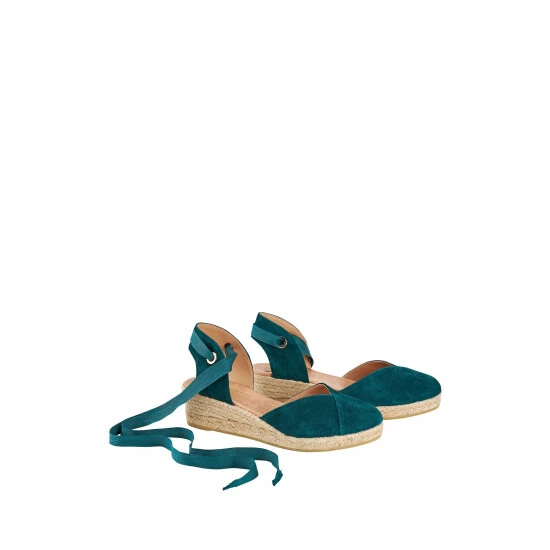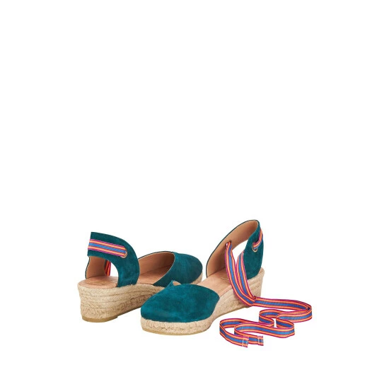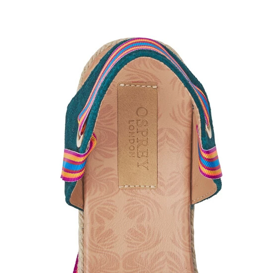 Reasons to love them: Elegant ankle-fastening teal espadrilles for easy summer style. Two looks in one with a set of plain ribbons and a set of stripey boho ribbons. Nothing says summer like a great pair of espadrilles, and so Osprey London delighted to introduce The Hendrix. These elegant new mid-height wedges with ribbon ties are crafted for Osprey London in Spain in small quantities. In sumptuous teal suede with an almond-shaped toe, these beautifully wearable sandals feature a traditional woven wedge, created using sustainable Jute. With their matching tan ribbons, the look is chic and pared-back, making The Hendrix a summer wardrobe staple. But there’s more… Inspired by the joyfully colourful straps on Osprey London’s bestselling bag, The Hendrix Leather Hobo, these namesake espadrilles come with a second pair of grosgrain ribbons in stripes of blue, yellow, green, purple and orange for a boho-luxe look that’s perfect for parties, poolside or simply for expressing your joie de vivre!