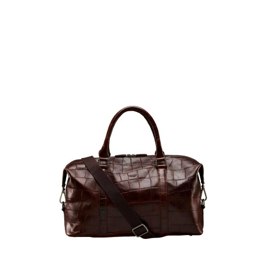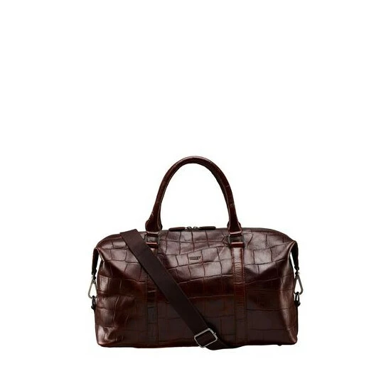 OSPREY LONDON travel holdall, handcrafted in supple, vegetable tanned cowhide embossed with a large croc print, featuring smart self-coloured stitching and antiqued silver metal hardware throughout. Interior is lined in chocolate Cotton Twill and includes two slip pockets and a zipped pocket framed in leather with a smart leather zip-pull.
