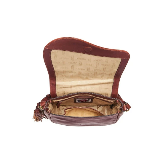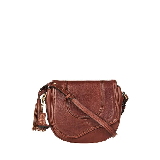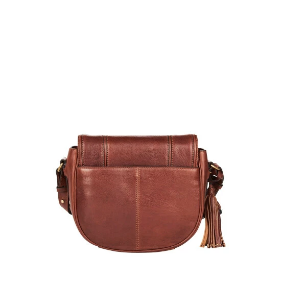 OSPREY LONDON cross-body bag with a rounded profile and saddle shaped flap, all handcrafted in sumptuous cognac Saddle leather featuring stab stitch detail and bronze metal hardware throughout. The interior features a zipped pocket framed in matching leather with a smart leather zip-pull, plus an additional slip pocket. Dimensions: H: 23 x L: 25 x W: 8.5 cm (55-58cm strap height).