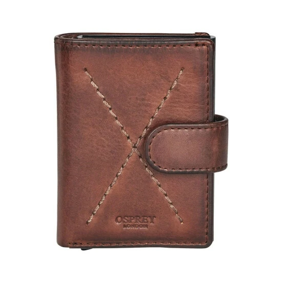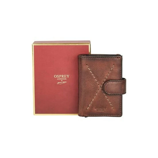 Traditional on the outside, this ingenious design features an ID holder and an integrated metal card case with RFID protection. Handcrafted in leather which just gets better with age it has a leather tab and popper closure. With a note section along the top and two card slots on the left, behind the mesh ID window on the right is a metal card case with space for up to six more bank cards. Simply pull the toggle and out they smoothly slide. Comes in an OSPREY LONDON presentation box.