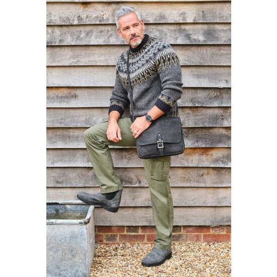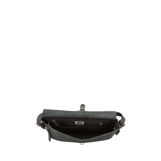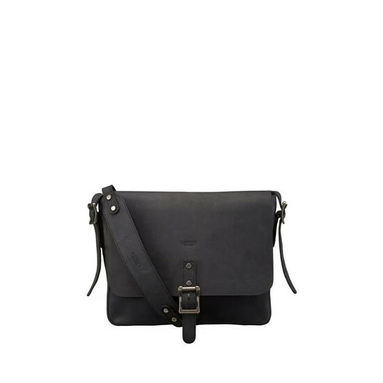 OSPREY LONDON artisanal messenger bag, handstitched in characterful and robust Snuffed Grain leather with a pre-weathered look with self-coloured stitching and hand-applied edge-stain. A neat A4-compatible size with flat sides and base. The interior is unlined and features an integrated full-length Canvas pouch containing two slip pockets and one large zipped pocket with leather zip pull. There is also a metal ring onto which a keyring could be clipped.
