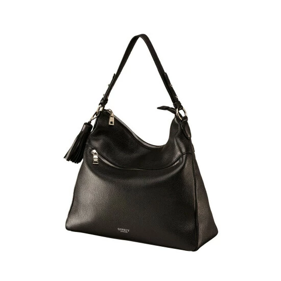 OSPREY LONDON slouchy zip-top shoulder bag, handcrafted in Grainy Hide leather, offered with a choice of two straps and featuring a statement leather tassel hanging on one side. You can alter the length of the strap by adjusting the silver metal studs on the strap. A4-compatible interior features two slip pockets and a zipped pocket with a smart leather zip-pull. Dimensions: H: 31 x L: 38 x W: 13 cm (17-20cm handle height) (47cm strap height).