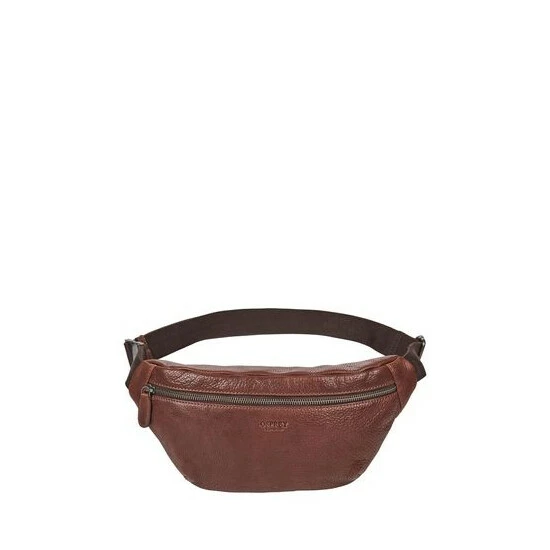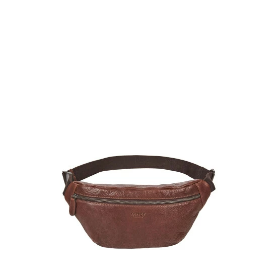 OSPREY LONDON large sling bag, handcrafted in characterful cognac Glazed Calf leather, featuring an adjustable chocolate brown Canvas webbing strap. Dimensions: H: 16 x L: 34 x W: 5 cm (28-53 cm strap height)