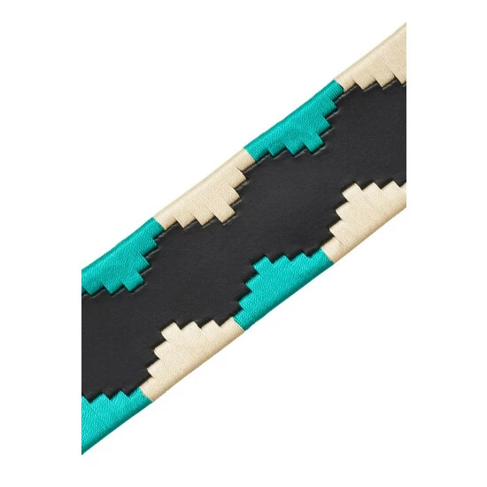 Crafted using traditional saddlery techniques, this natural raw-edge, hand finished belt is cut from vegetable tanned cow hide 5cm wide, which is polished by hand and then handstitched using waxed cotton thread in cream and turquoise in a geometric pattern running along its length. Each belt can take up to four hours to stitch to create this stunning, detailed effect making it an item to wear and treasure for many years to come. Finished with a solid brass roller buckle, it features a single leather keeper and five notches.