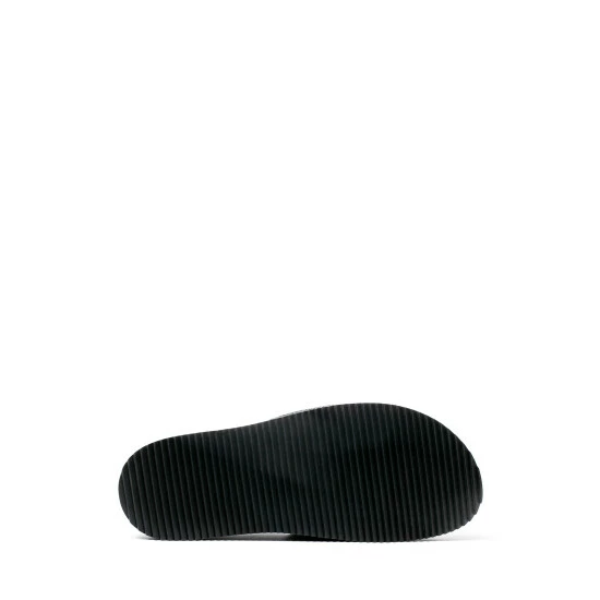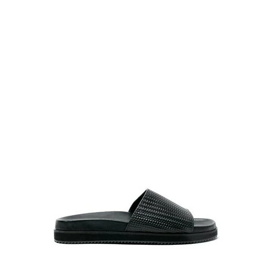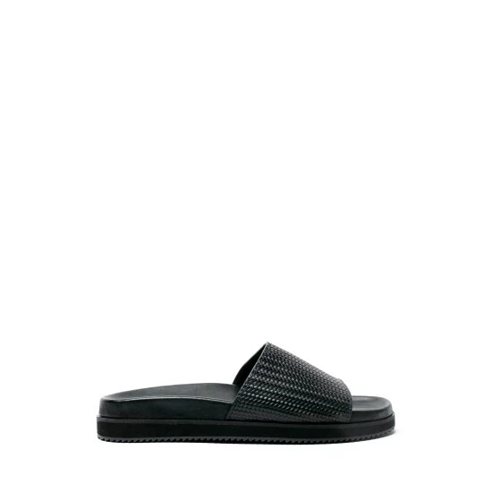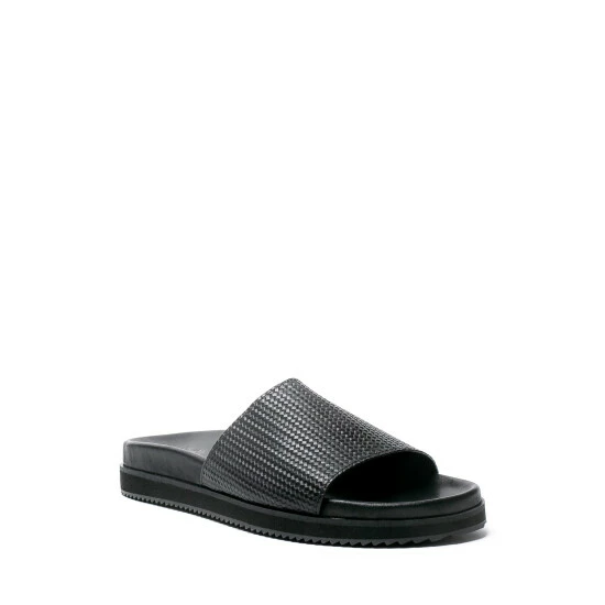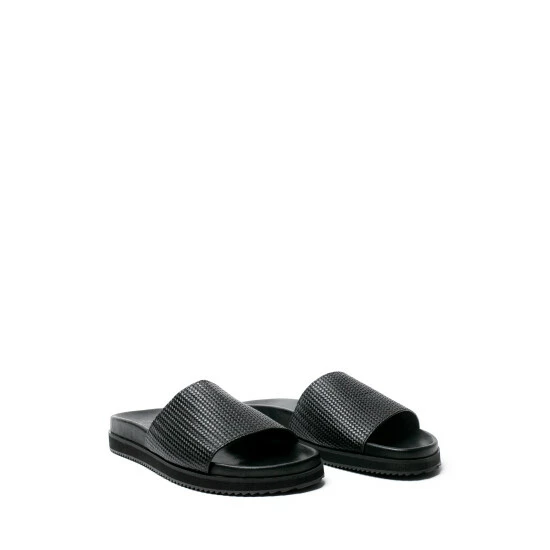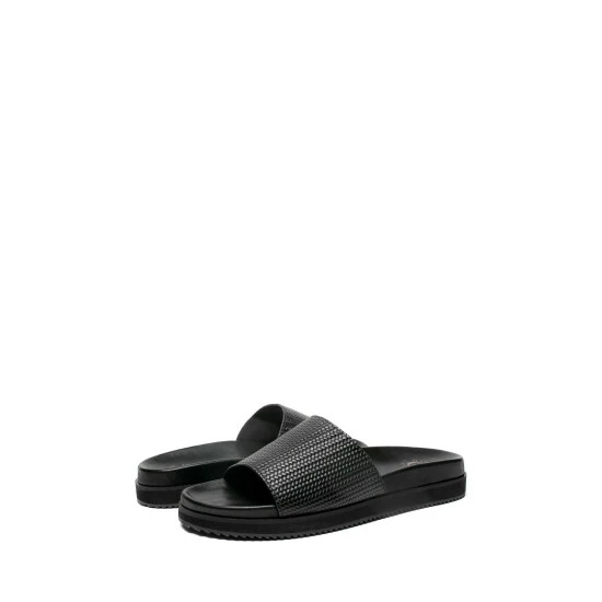 Leather slide crafted for Osprey London in black textured leather. Easy slip on slide whatever the occasion. Fully leather lined in black with an Osprey London logo on the footbed. Black rubber sole with an elevated footbed for comfort and easy wearing. Also added texture on the sole for a better grip when wearing.
