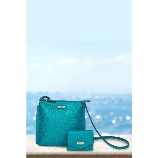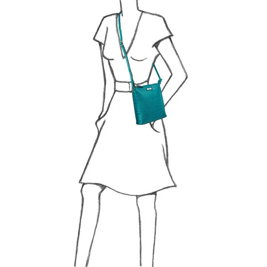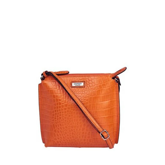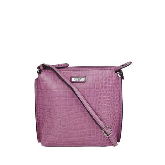 OSPREY LONDON zip-top cross-body, handcrafted in croc embossed leather and given a high shine finish. Comes with a flat leather strap wear across the body or over the shoulder. The interior features a slip pocket for your phone and a zipped pocket with a smart leather zip-pull framed in matching leather. Dimensions H: 21 x L: 19 x W: 4.5 cm (30-60cm strap height).