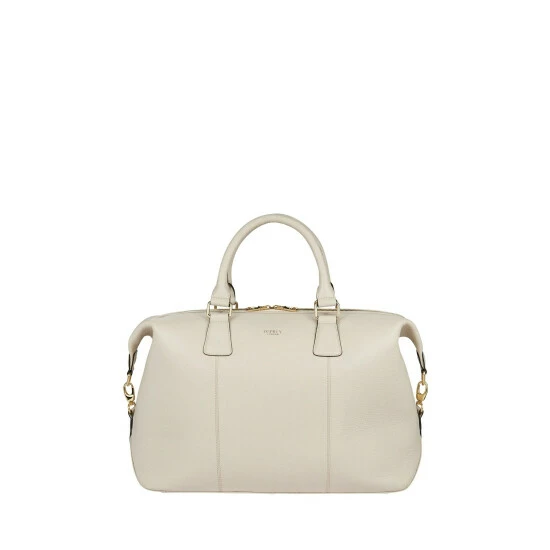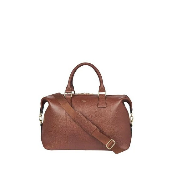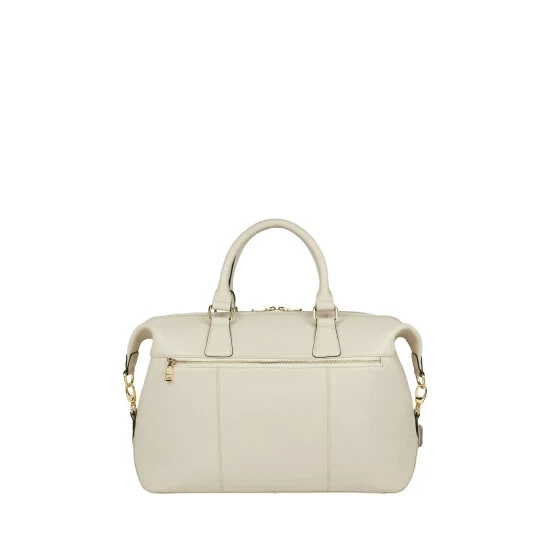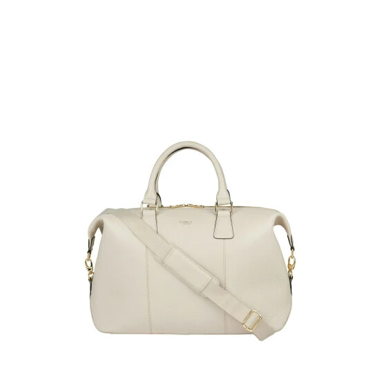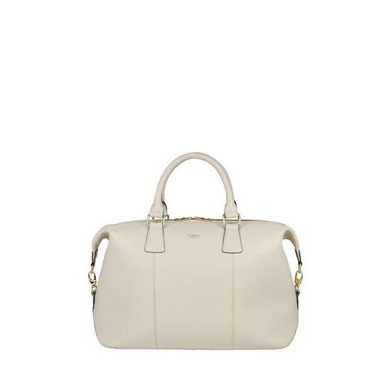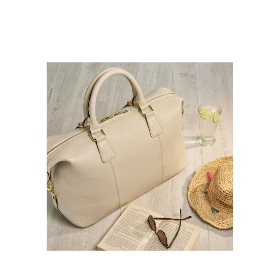 Sleek, structured OSPREY LONDON holdall, handcrafted in Grainy hide leather, with smart self-coloured stitching and gold metal hardware throughout. Features two drop-down rolled leather handles with gold metal rings set on exquisitely shaped leather mounts.