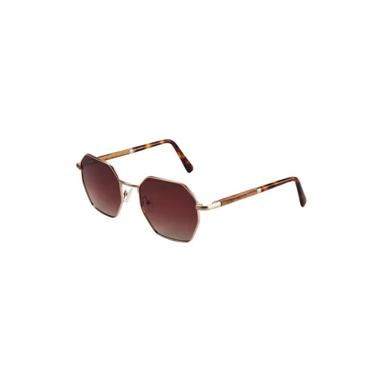 Hexagonal OSPREY LONDON sunglasses, crafted in brushed gold metal and brown polarised lenses. The slender, rounded arms are handcrafted in Zebrawood into which the OSPREY LONDON logo has been lasered at the temples, while the tips are made in tortoiseshell. Cellulose Acetate for added style and comfort. 1.1mm TAC polarised lenses with UV400 protection. Filter category 3: dark tint reduces glare. Do not view the sun directly and do not wear in a solarium. Supplied with a black microfibre cleaning cloth and a fold-flat kraft paper case. Dimensions: 52 x 21 x 142 mm.
